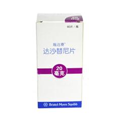施达赛(达沙替尼片) 【商品名称】施达赛 【通用名称】达沙替尼片 【别名】扑瑞赛 【英文名称】DasatinibTablets 【成份】达沙替尼 【性状】为白色或类白色、双凸椭圆型薄膜衣片。 【适应症】适用于对包括甲磺酸伊马替尼在内的治疗方案耐药或不能耐受的 慢性髓细胞样白血病(CML)所有病期(慢性期、加速期、淋巴细胞急变期和髓 细胞急变期)的成人患者。另外,达沙替尼片可用于对以往治疗药物耐药或 不能耐受的费城染色体阳性急性淋巴细胞性白血病(Ph+All)成年患者。 【用法用量】口服慢性粒细胞性白血病慢性期:100mg,每天1次,可增加至 140mg,每天1次。慢性粒或淋巴细胞性白血病进展期或Ph染色体阳性(Ph+) 的急性淋巴细胞白血病:初始剂量:70mg,bid,可增加至100mg,bid。 【规格】20mg*60片/盒 【价格】8200元/盒 【贮藏】密封,低温阴凉干燥保存。 【注册证号】H20110430 【生产企业】百时美施贵宝公司 我司谨遵循在严把质量关的同时把药品价格降到了最低,让广大患者得到实 实在在的实惠,真真正正的做到让利于民,平价到底! 24小时订购热线电话:13666158758(许先生) 全国各地免费负责送货.注:本地可送货上门,外省市一律EMS特快专递送货!